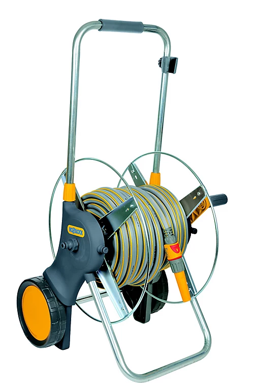 Facile à déplacer dans le jardin. Dévidoir en métal sur roues avec tuyau 25m. Rangement pour accessoires sur la poignée.