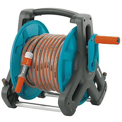 Deux produits en un : Dévidoir mural pour ranger le tuyau après utilisation sur un mur et dévidoir portable pour transport facile dans tout le jardin.<br/><br/><li>Destination : Mural et mobile.</li><li>Matière principale : PVC.</li><li>Capacité d’enroulement : 50m de tuyau ø13 mm ou 40m de tuyau ø15 mm ou 30m de tuyau ø19 mm.</li><li>Enroulement automatique : Non.</li><li>Roues incluses : Non.</li><li>Dimensions : 39,5 x 39,5 x h.46 cm.</li><li>Accessoires fournis : Nez robinet, adaptateur, raccords rapides, raccord aquastop, lance multijet.</li>