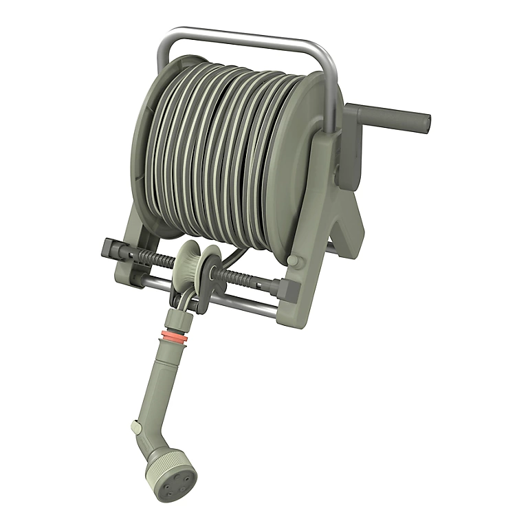 - Le dévidoir peut être utilisé en mode autoportant ou mural, ce qui vous permet de le déplacer partout où vous le souhaitez. Le montage mural est idéal pour gagner de l’espace dans votre jardin.