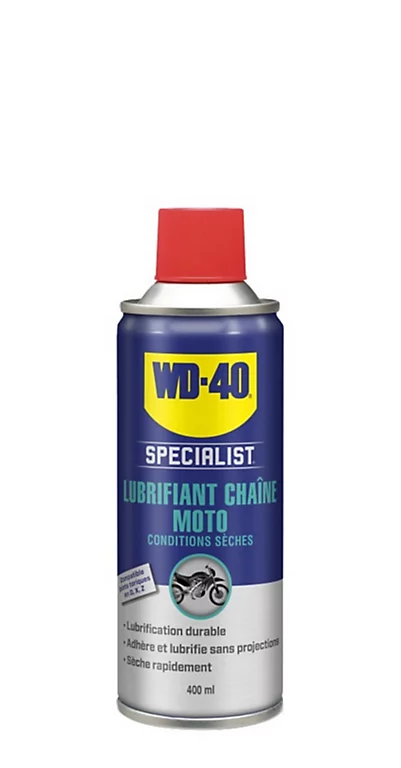 Le Lubrifiant Chaîne Conditions Sèches WD-40 Specialist Moto apporte une lubrification et une protection durables à la chaîne et est compatible avec les joints toriques en O, X et Z. Son exceptionnelle action longue durée le rend particulièrement adapté aux environnements secs. De plus, il sèche rapidement et dispose d’excellentes propriétés anti-éclaboussures. Une utilisation régulière aide à entretenir la performance et la durée d’utilisation de la chaîne.