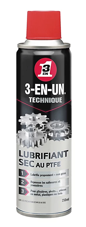 Aérosol 250 ml. Fortement dosé en PTFE (polytetrafluorethylène) le Lubrifiant Sec au PTFE 3-EN-UN TECHNIQUE a été spécialement formulé pour les cas où une lubrification non grasse et anti-adhérente est requise. Il laisse après séchage une fine pellicule blanche qui agit sans attirer les poussières et salissures. La lubrification reste performante, durablement. Recommandé pour les serrures, chaînes, glissières, pivots, convoyeurs, petits mécanismes, mais aussi comme agent de démoulage dans certaines industries.