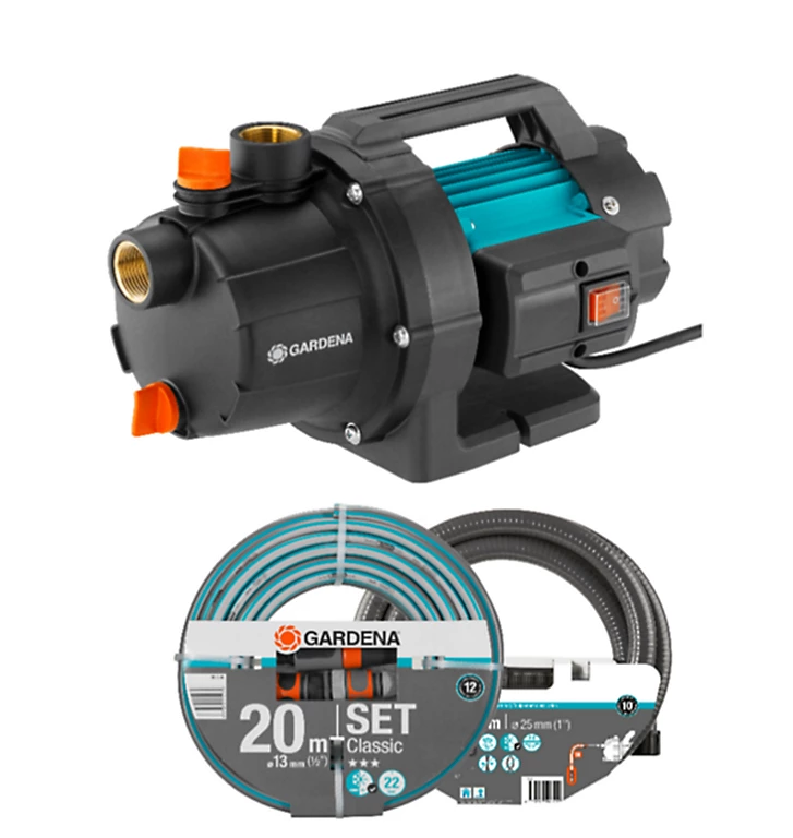 Pompe d’arrosage électrique Gardena Basic 3000/4 + tuyau 20 m et kit d’aspiration